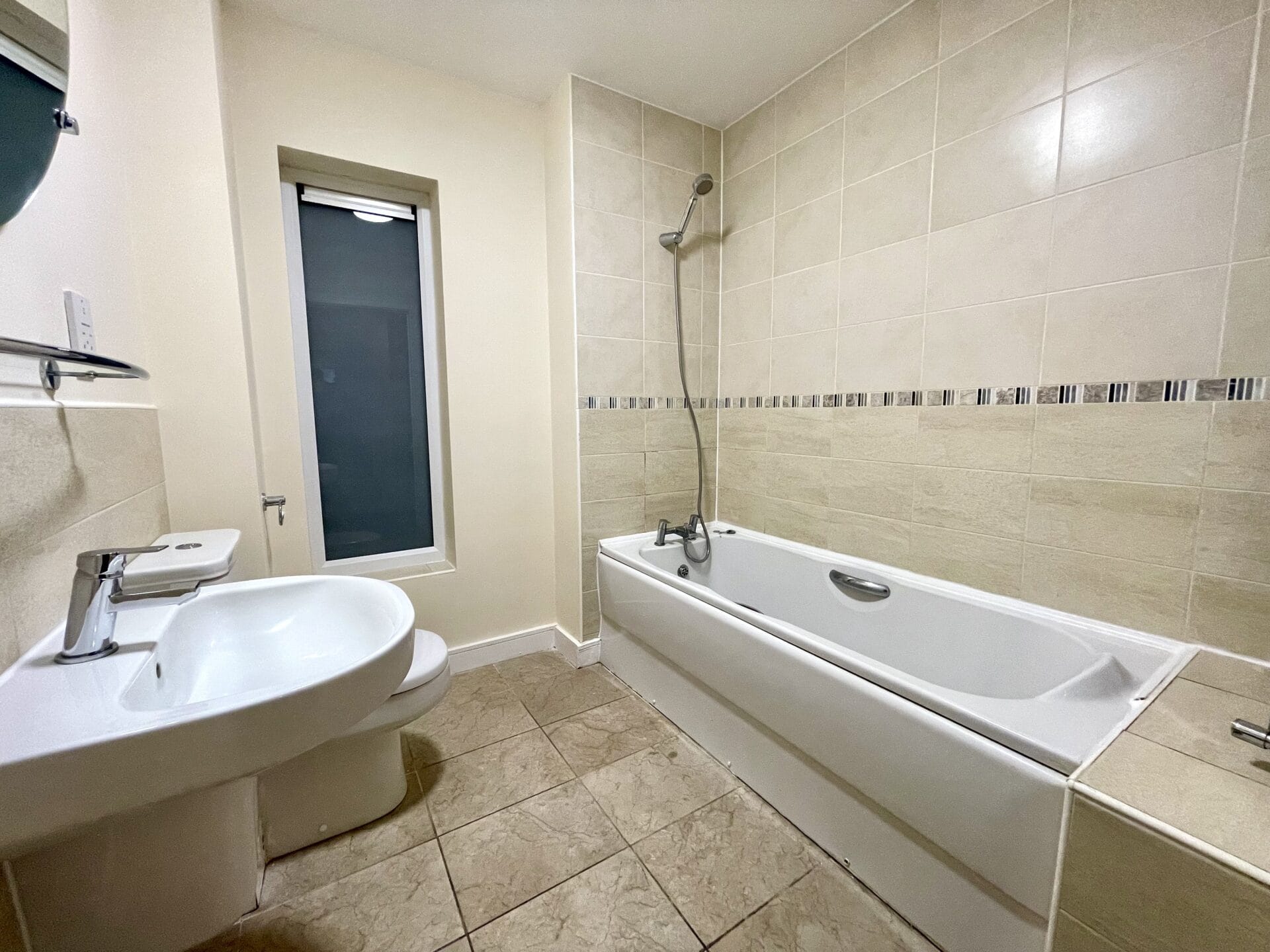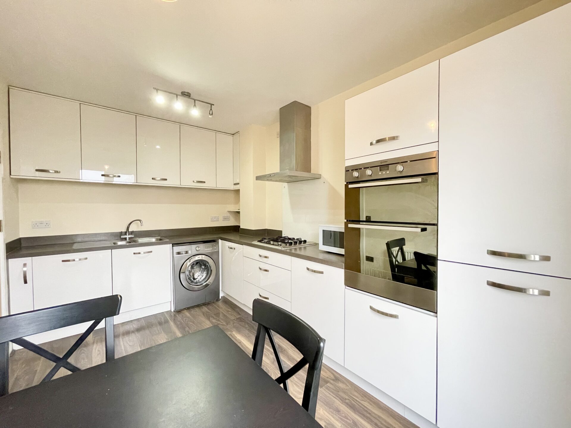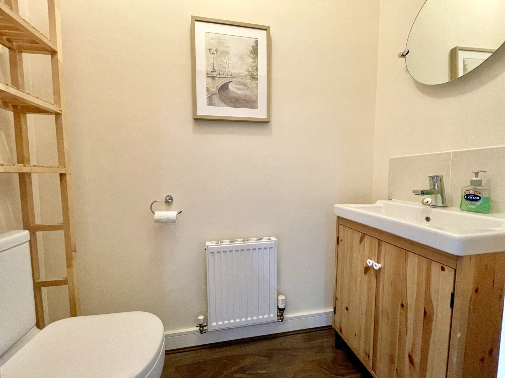 The ground floor comprises a spacious, fully fitted kitchen complete with oven, hob, fridge freezer and dishwasher, as well as a convenient downstairs WC. To the rear, the property benefits from a private, secluded garden, ideal for outdoor relaxation.
