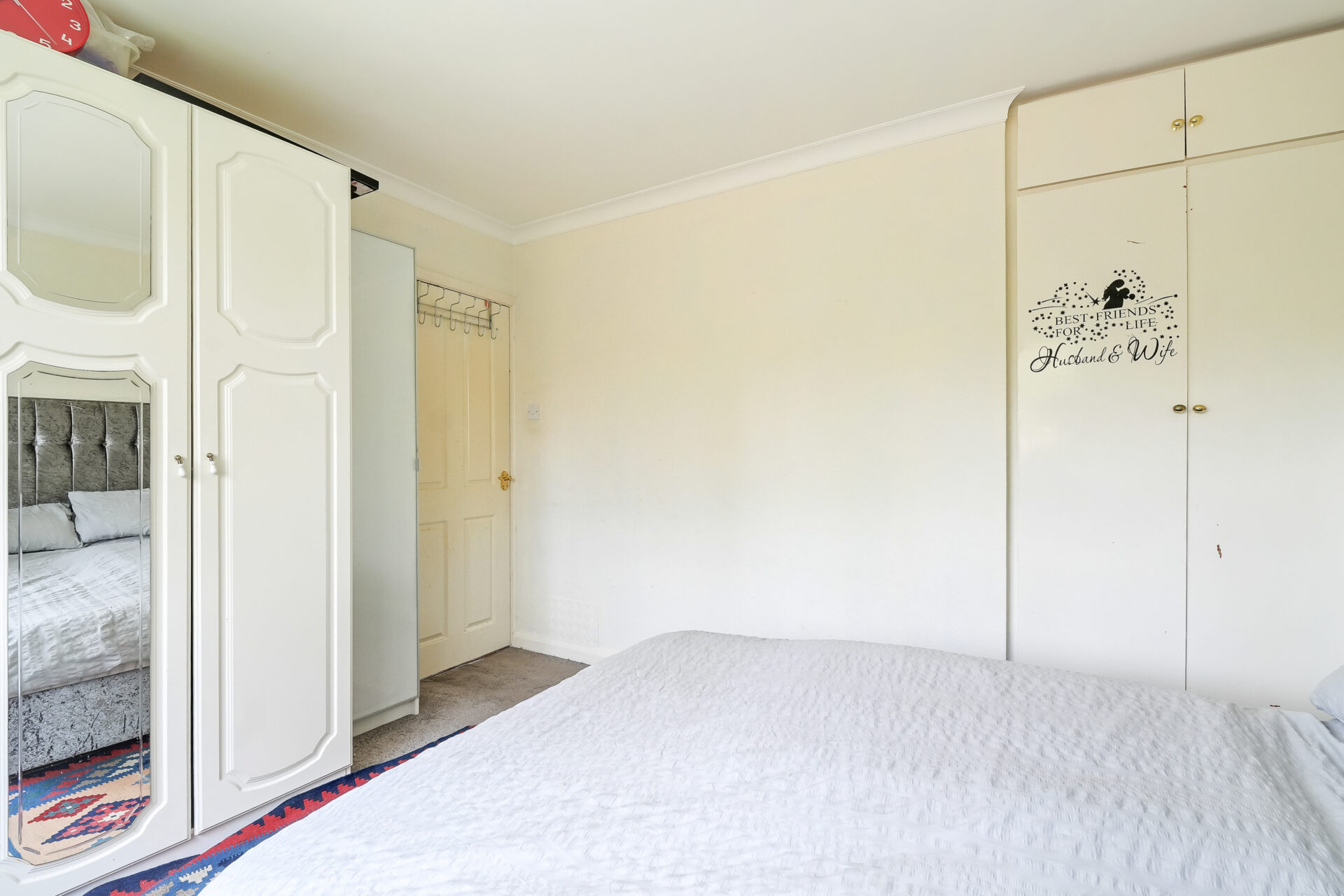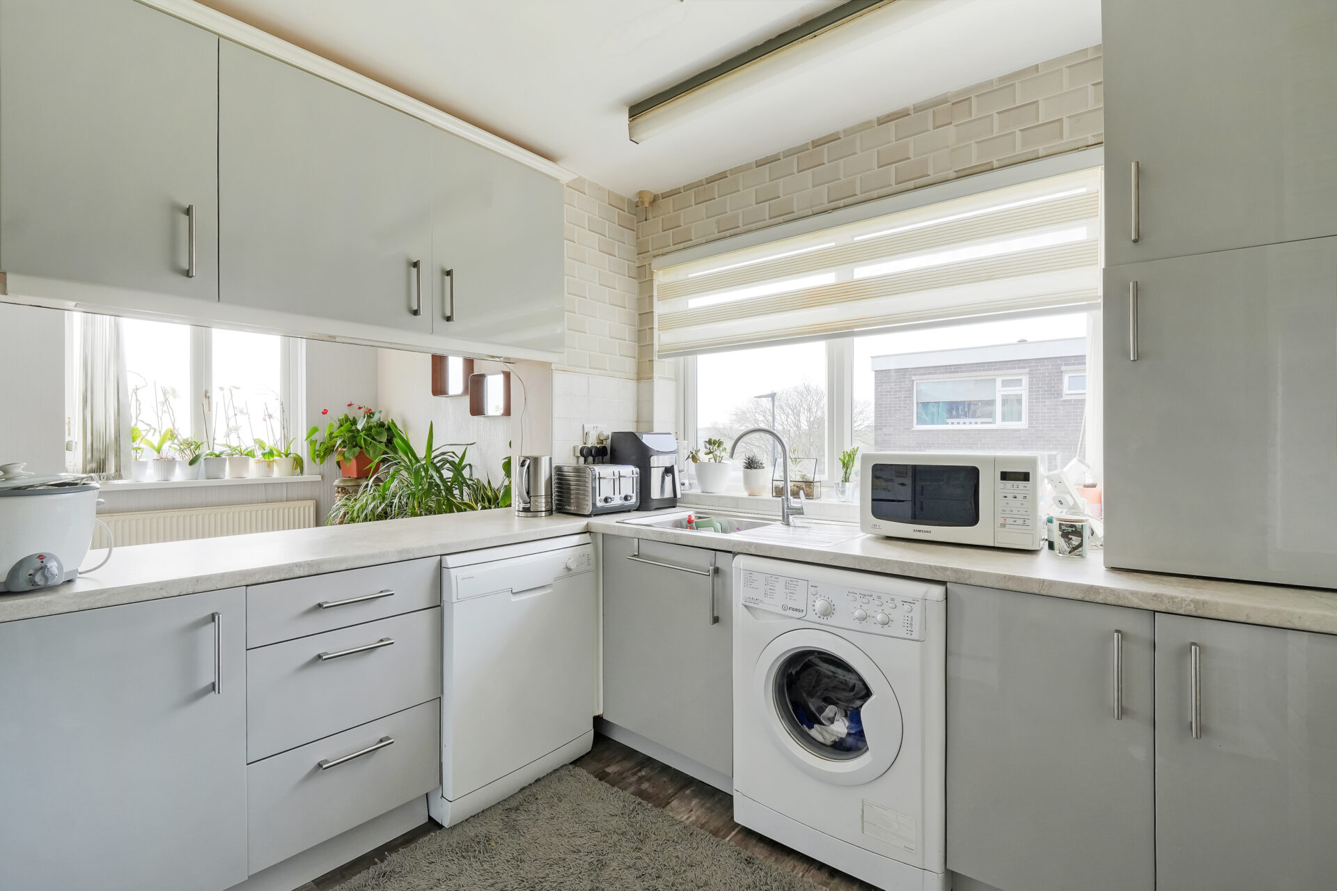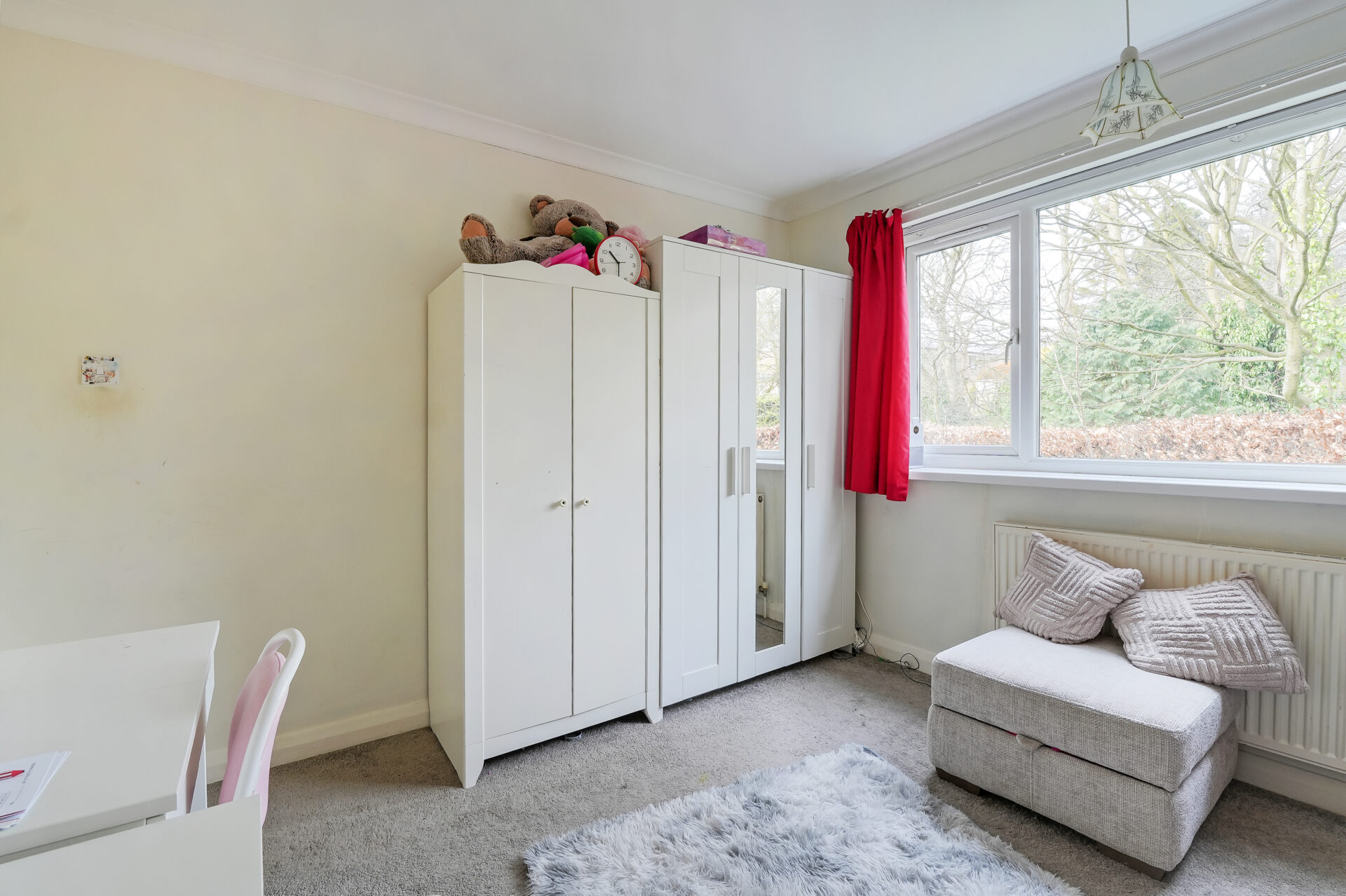 There are two generously sized double bedrooms, both complete with fitted wardrobes, providing excellent built-in storage. A neatly presented three-piece bathroom, along with additional storage in the hallway, enhances the practicality of the home. The apartment also benefits from a single garage, located within the development.