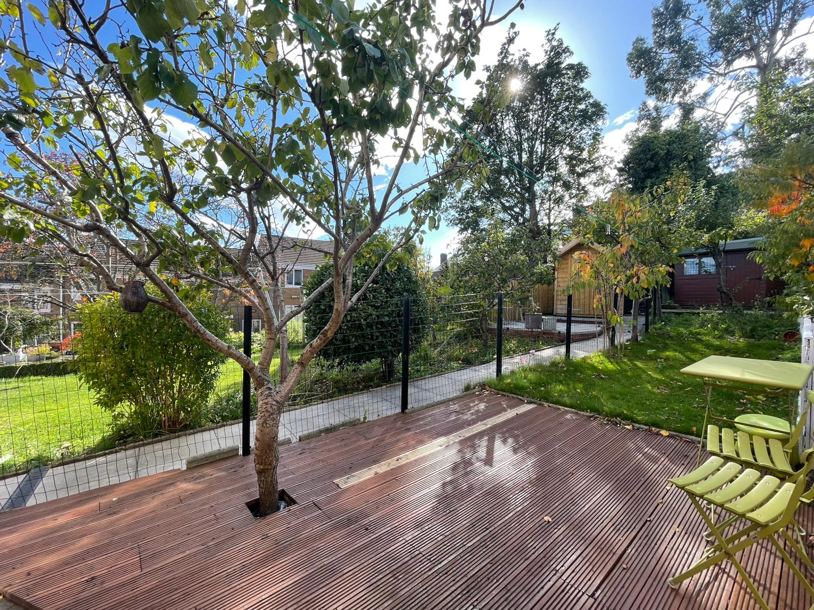 To the rear, enjoy a private garden with a decked seating area, lawn, and mature trees — offering a peaceful retreat for relaxing or entertaining.