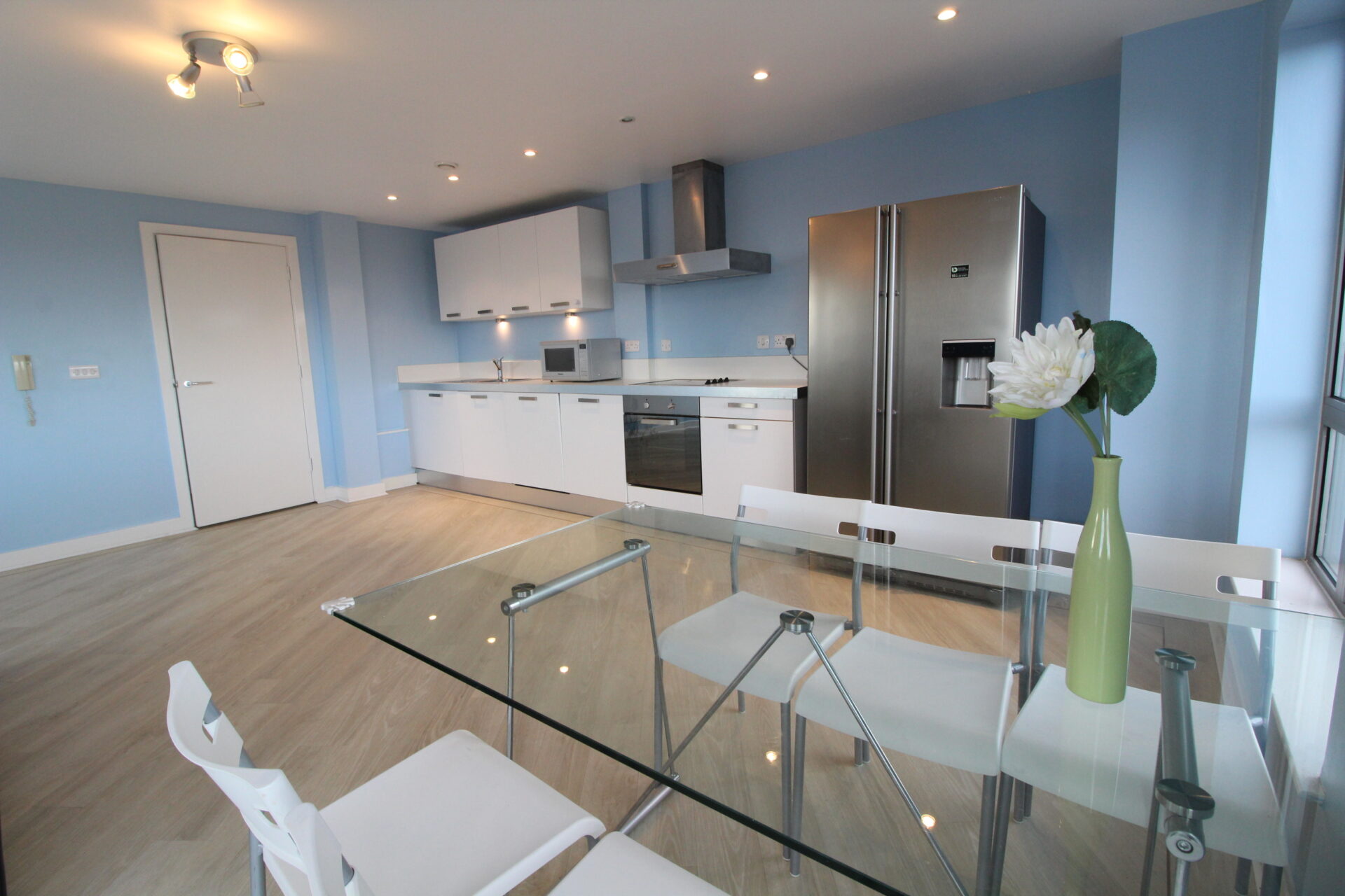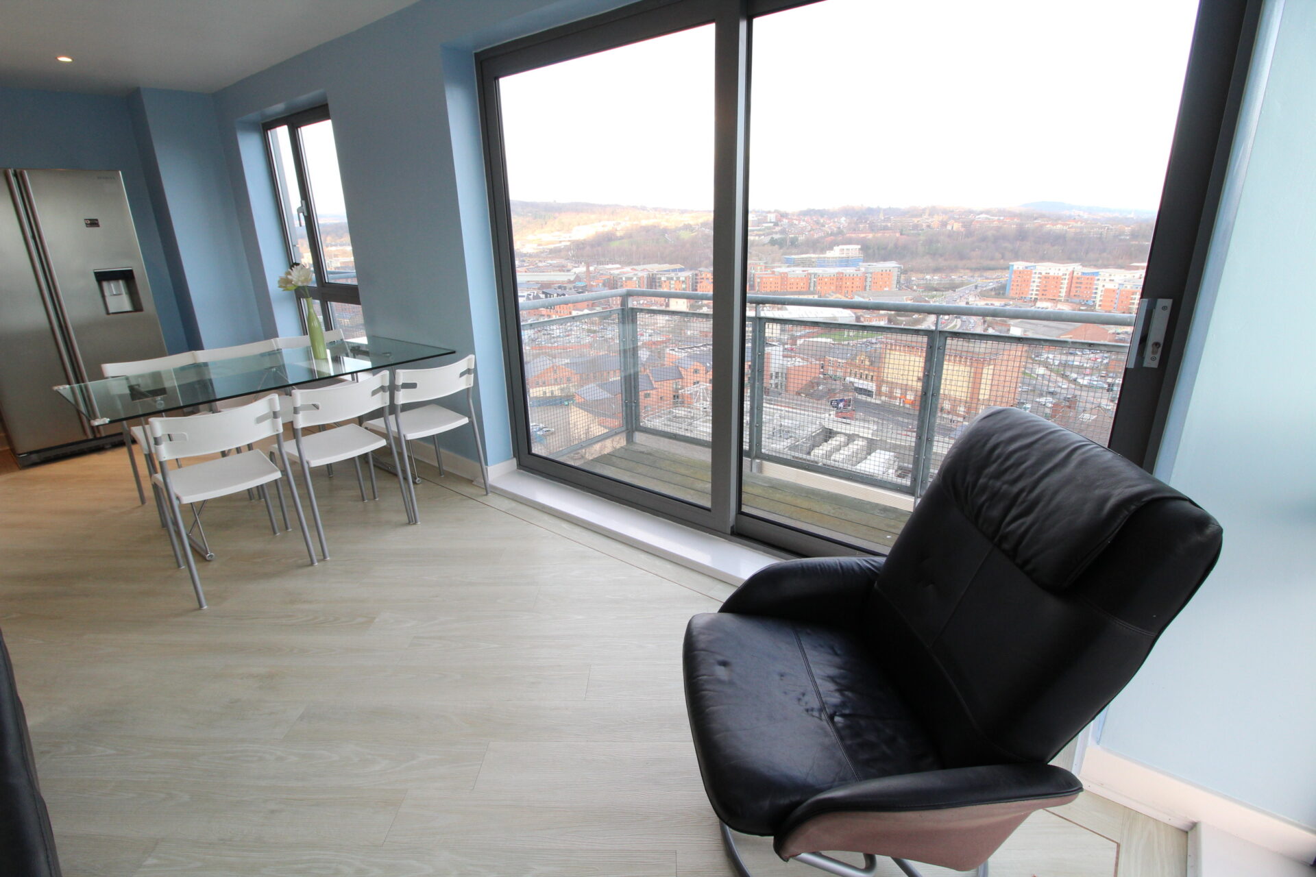 The heart of the home is a spacious open-plan living and kitchen area, perfect for both relaxing and entertaining. From here, doors open onto a private balcony, providing an ideal space for outdoor dining or enjoying the skyline.