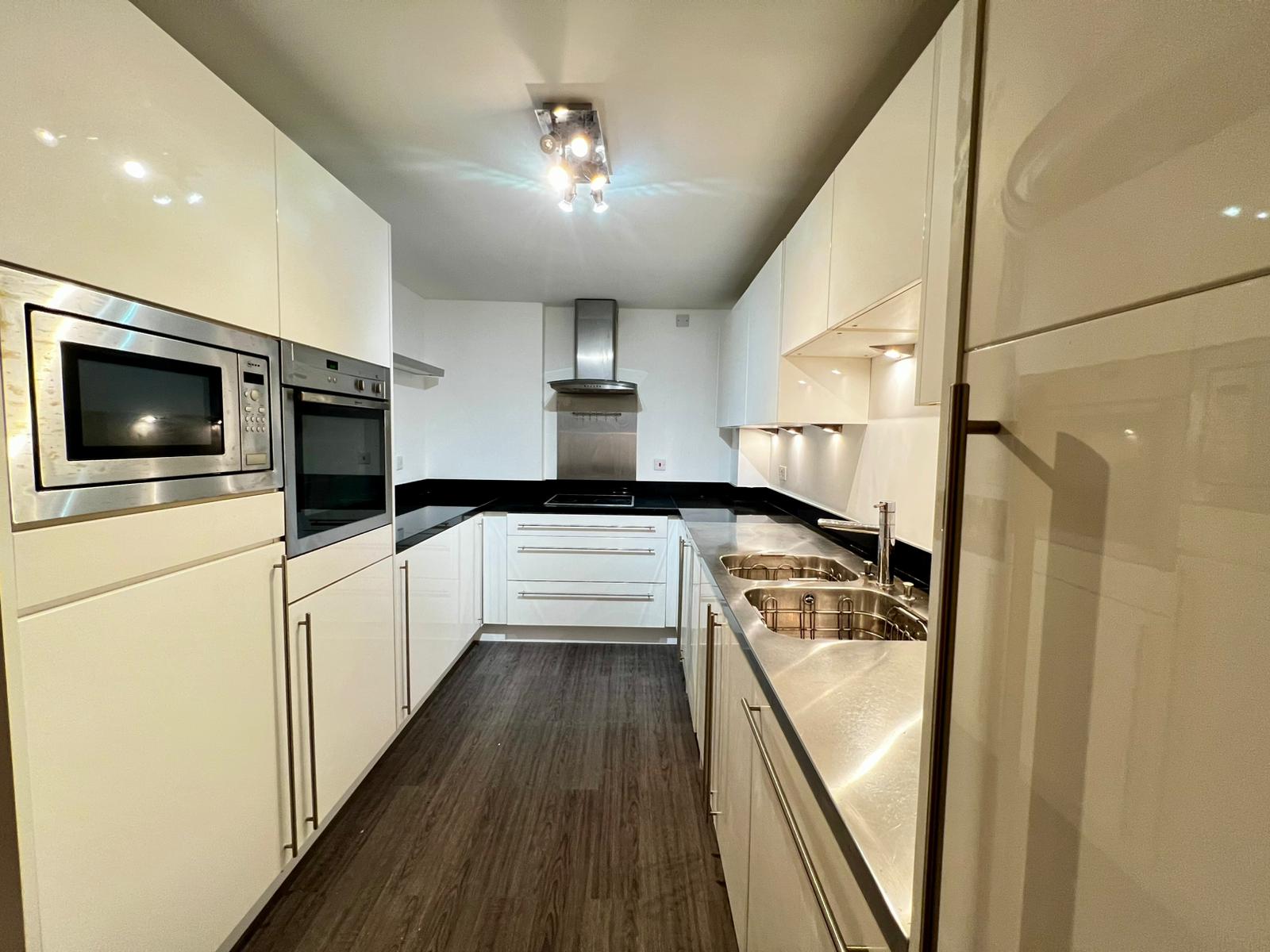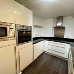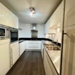 The modern kitchen comes fully equipped with integrated appliances, plenty of storage, and a clean, minimalist design — perfect for cooking and entertaining.
