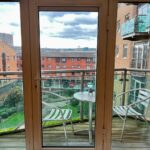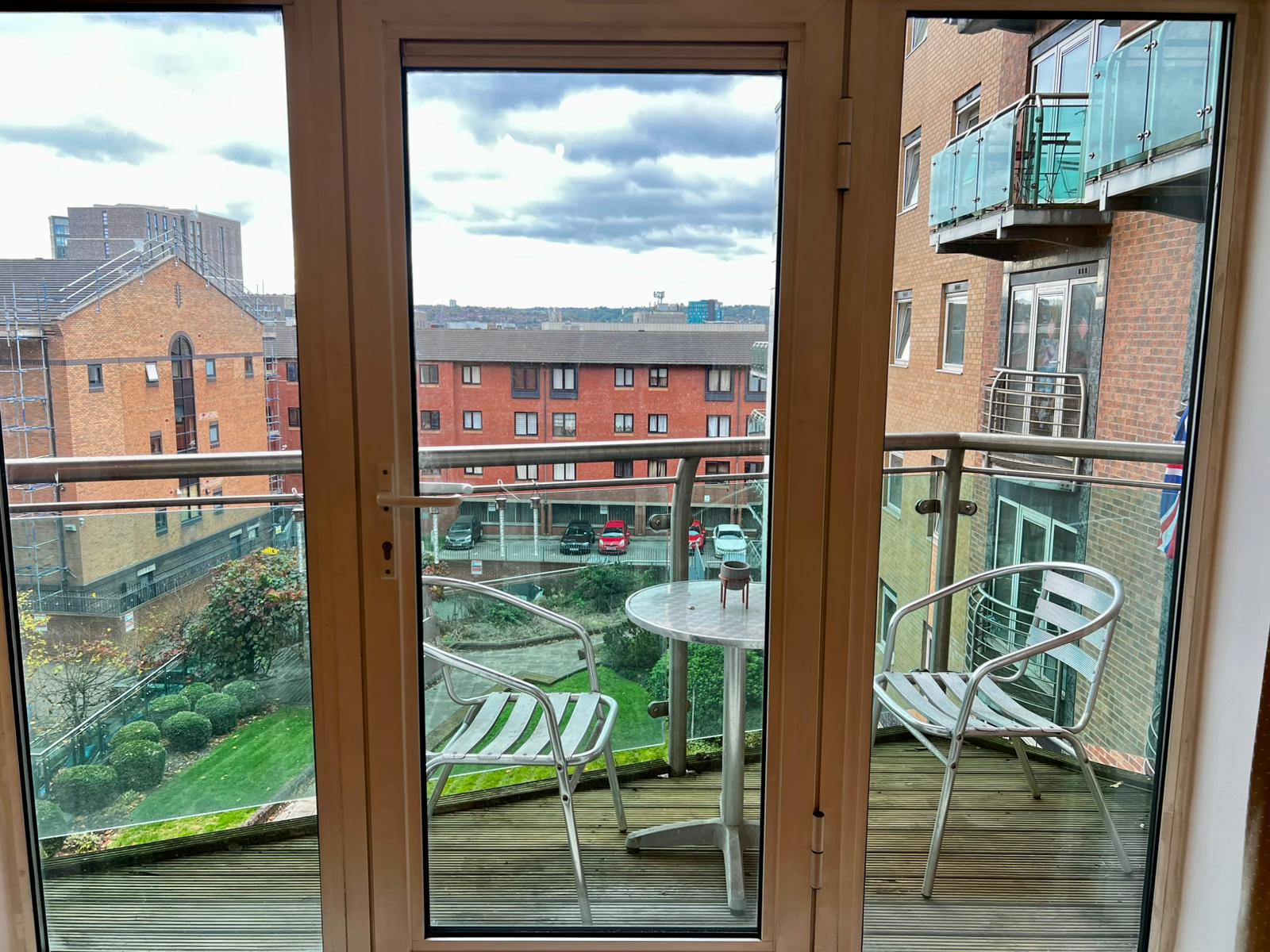 Enjoy your morning coffee or evening drink on the private balcony, overlooking the well-maintained communal courtyard and surrounding cityscape.